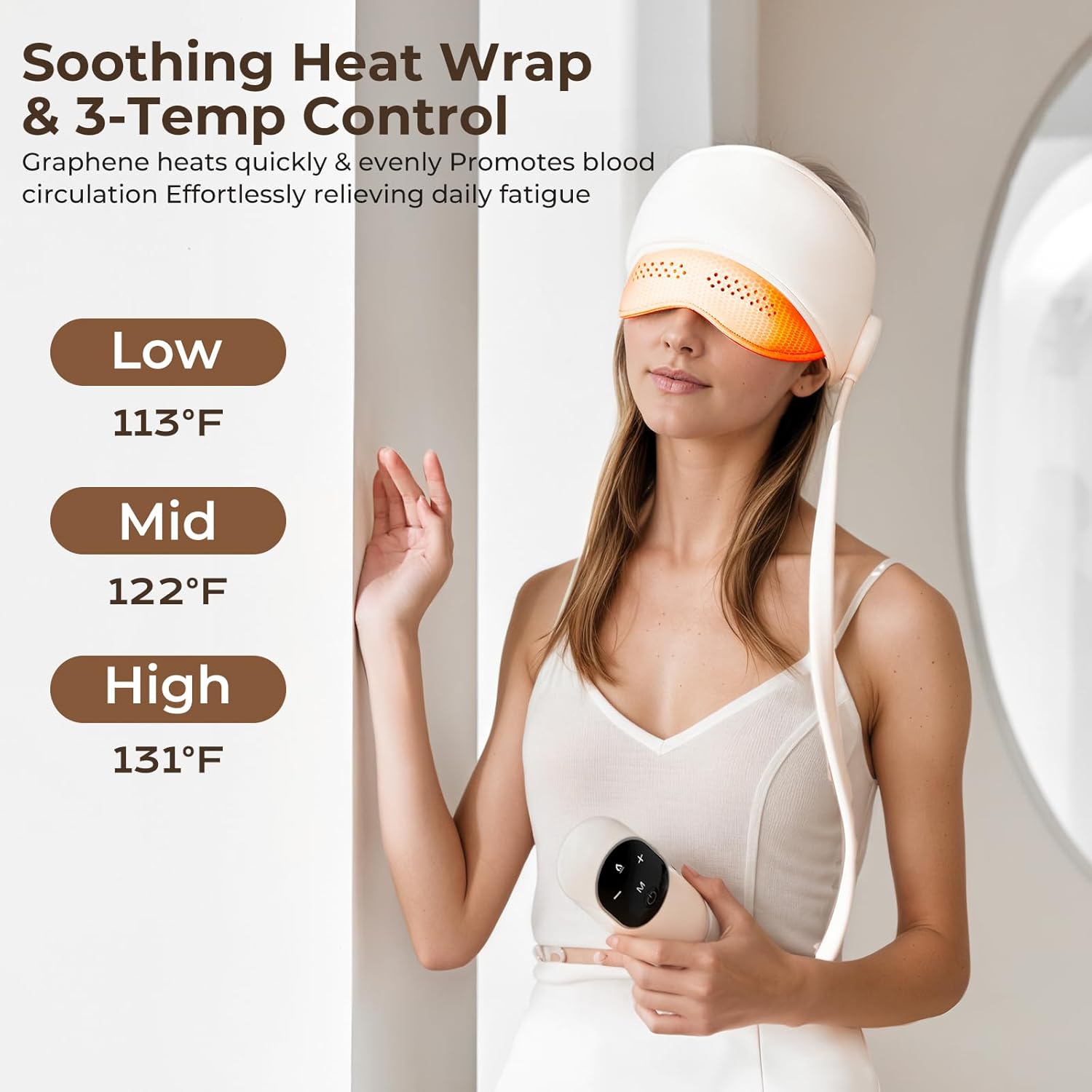 - 3-Level Eye Massager with Heat: This head and eye massager is specially equipped with an eye-area heating function, it offers 3 precise temperature settings ranging from 113°F to 131°F. This allows you to adjust according to your skin sensitivity and seasonal preferences. The gentle warmth helps relieve eye strain, reduce dark circles, and soothe dryness—ideal for users who spend long hours in front of computers or mobile devices, revitalizing tired eyes